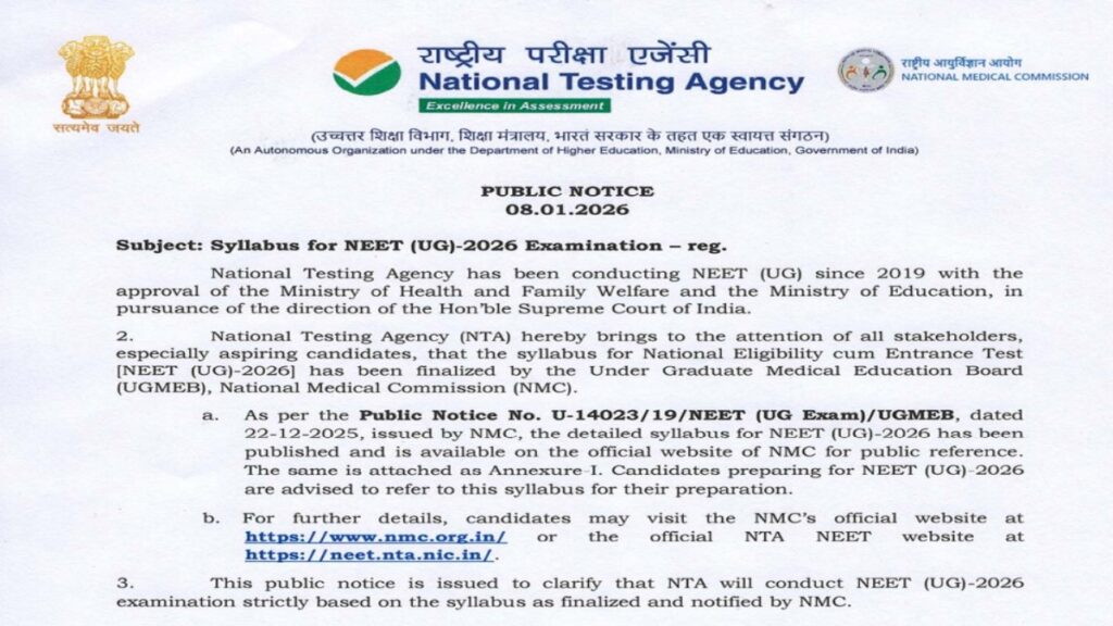 इस बार के सिलेबस में एनसीईआरटी की नई चुनौती और सहायक चिकित्सा शिक्षा की छात्रा पर ध्यान देने की तैयारी की गई है। एनएमसी ने स्पष्ट किया है कि नीट यूजी 2026 में 11वीं और 12वीं कक्षा के मुख्य विषय-फिजिक्स, केमिस्ट्री और बायोलॉजी-से प्रश्न पूछें।